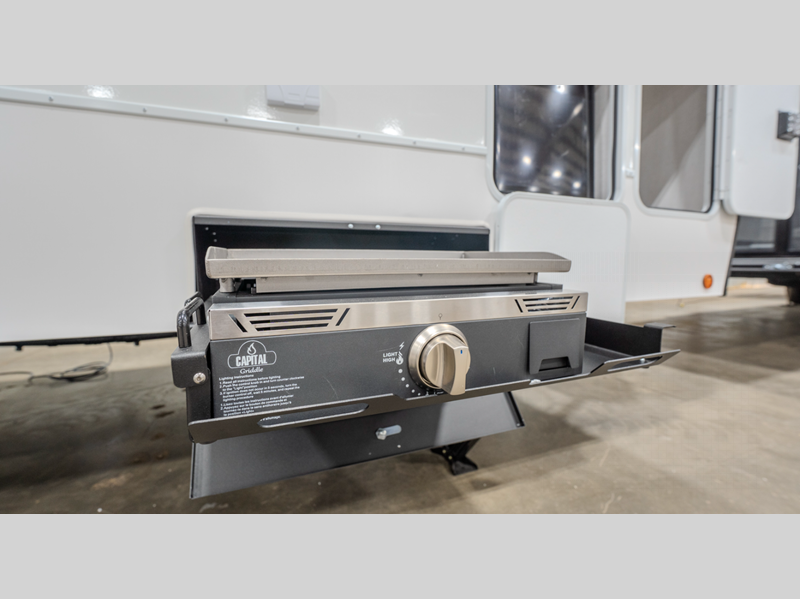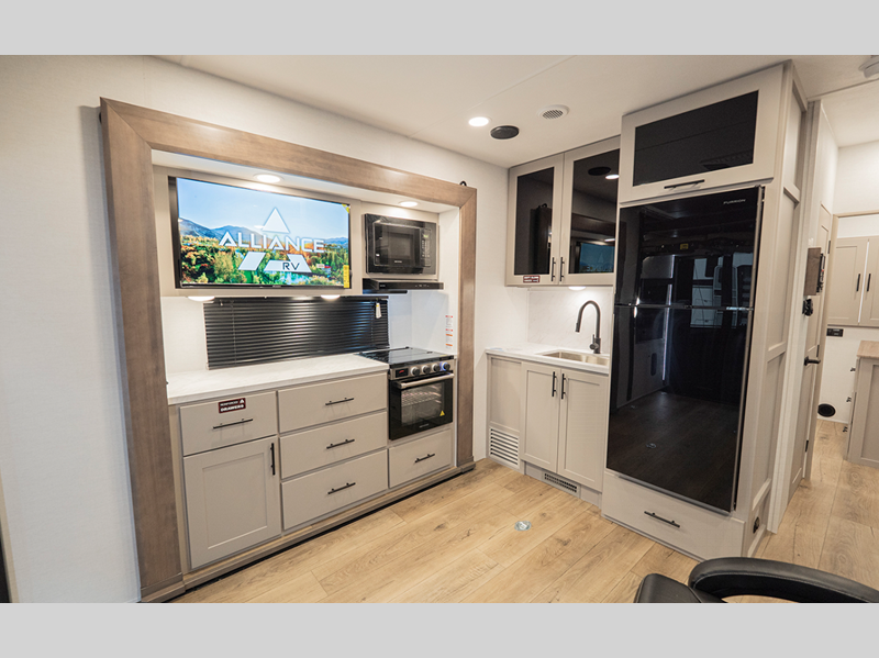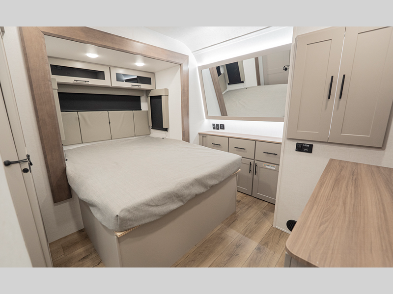 The 101" wide-body benchmark chassis provides plenty of space to bring along the dirt bikes, four-wheeler, or kayaks, and the Azdel-backed fiberglass sidewalls are ultra durable so you can enjoy your RV for years to come. You will appreciate the Garage Management System that includes a weather resistant ramp door, a fully insulated garage floor, and a multi-point tie-down system to keep your toys secure during transport. The interior will have you feeling at home with black cabinetry hardware, residential LED recessed ceiling lights, a large residential shower, and many more comforts.