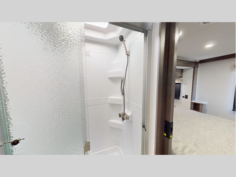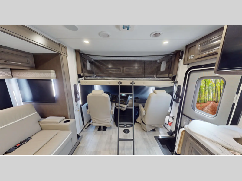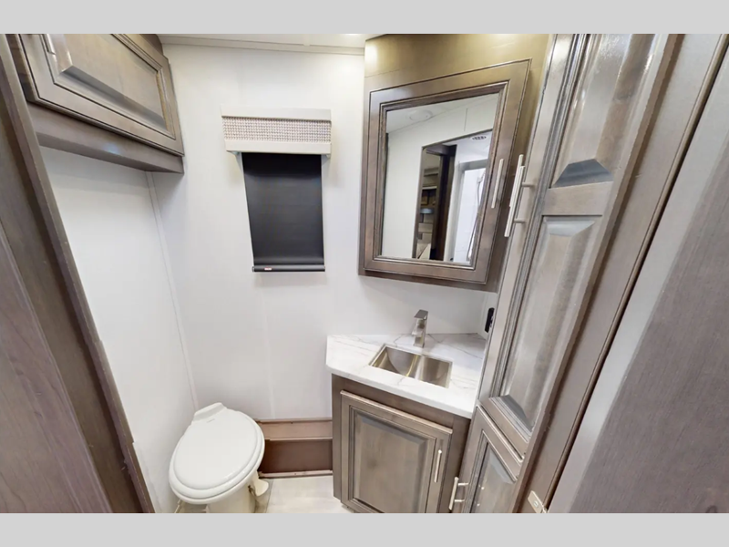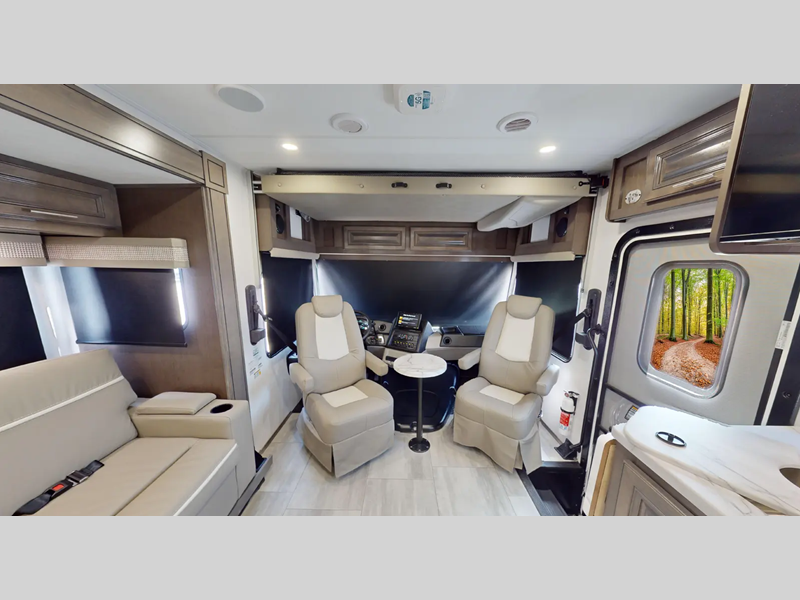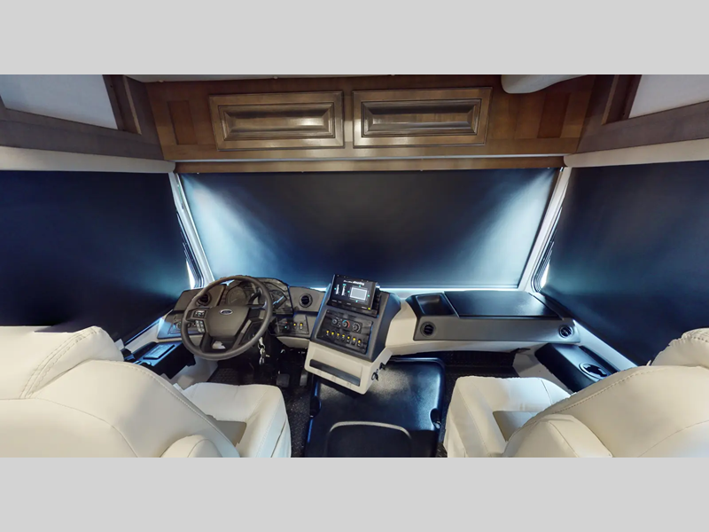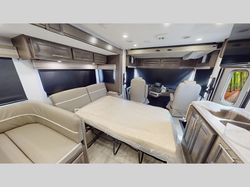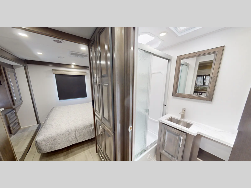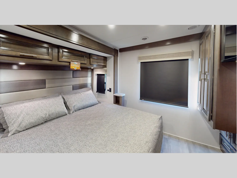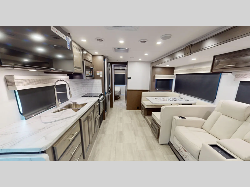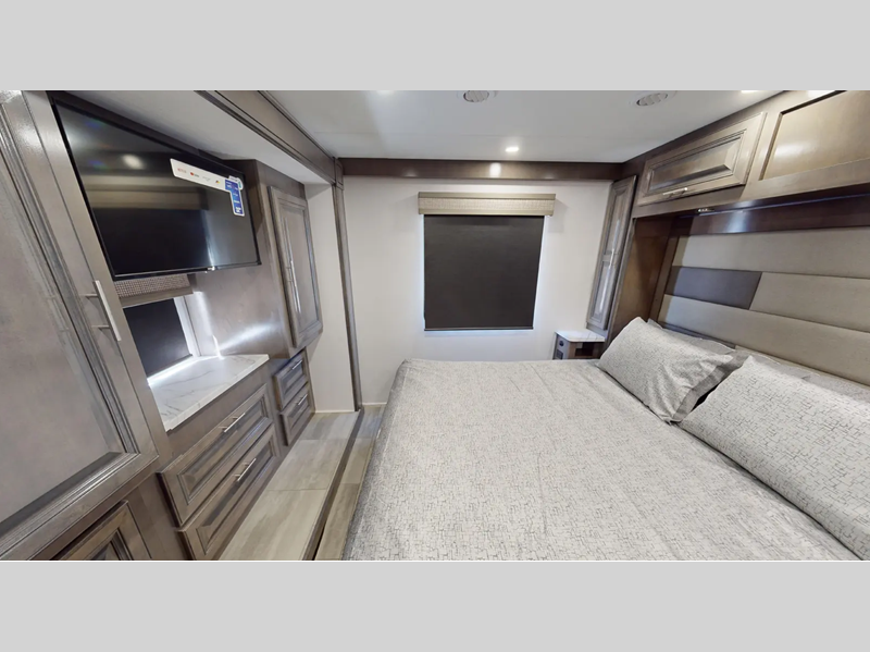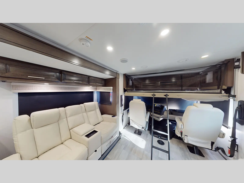 You will love the features that come standard on each model, like the hydraulic 4-point leveling system, color side and rear cameras, thermal foil kitchen countertops, and an LED TV in the living room to name a few. The durable construction includes a one-piece fiberglass roof, aluminum framed vacuum bonded floors, and high density block foam insulation so you can enjoy your coach for years to come. And we haven't even mentioned the exterior conveniences; a solar panel with a controller, a power awning with LED lights, an outside entertainment center, and more!
