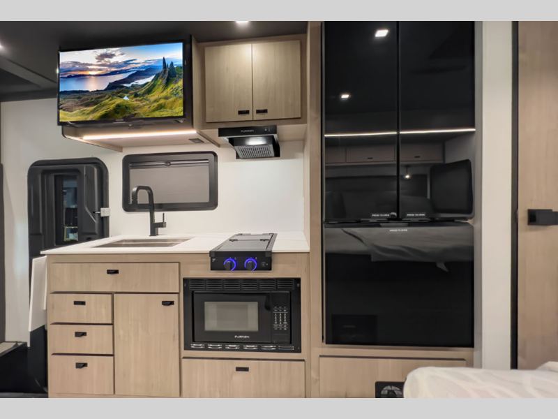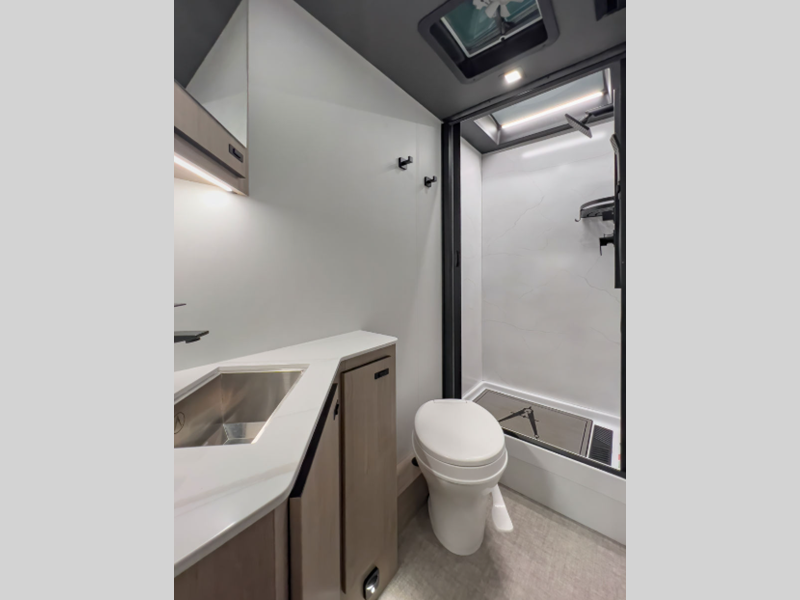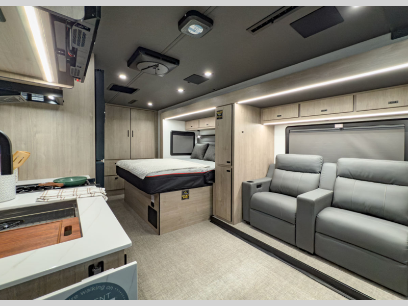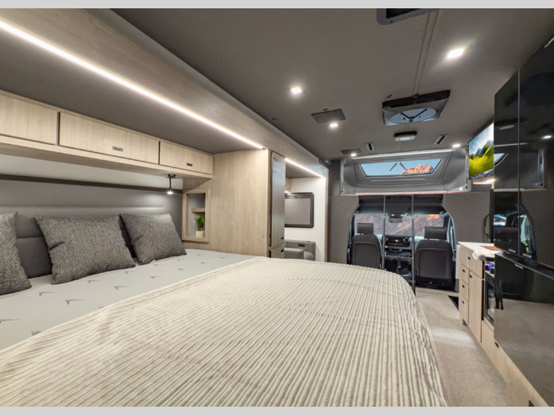 Sleeps 3 Slides 1 Length 25 ft 8 in Ext Width 7 ft 11 in Ext Height 11 ft 5 in Int Height 6 ft 8 in GVWR 12125 lbs Fresh Water Capacity 36 gals Grey Water Capacity 30 gals Black Water Capacity 30 gals Tire Size LT215/85 R16DRW Furnace BTU 20000 btu Generator 3.6kW Onan Fuel Type Diesel Engine Twin Turbo 2.0L Inline 4 Cylinder Chassis Mercedes-Benz Sprinter 4500 Horsepower 208 hp Fuel Capacity 24.5 gals Wheelbase 170 in Number Of Bunks 1 Available Beds King Torque 332 ft-lb Refrigerator Type 12V Refrigerator Size 10 cu ft Shower Size 24" x 34" Number of Awnings 1 Axle Weight Front 4630 lbs Axle Weight Rear 7934 lbs LP Tank Capacity 20.30 lbs. Water Heater Type Tankless AC BTU 15000 btu TV Info LR 32" 12V LED Smart TV, BR 32" 12V LED Smart TV Awning Info 16' Gross Combined Weight 15249 lbs Shower Type Standard Similar Floorplans