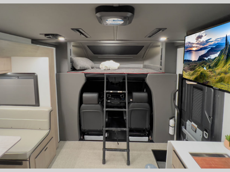 - Molded front overhead bunk with Lights, Chargers, Privacy Curtain and A/C