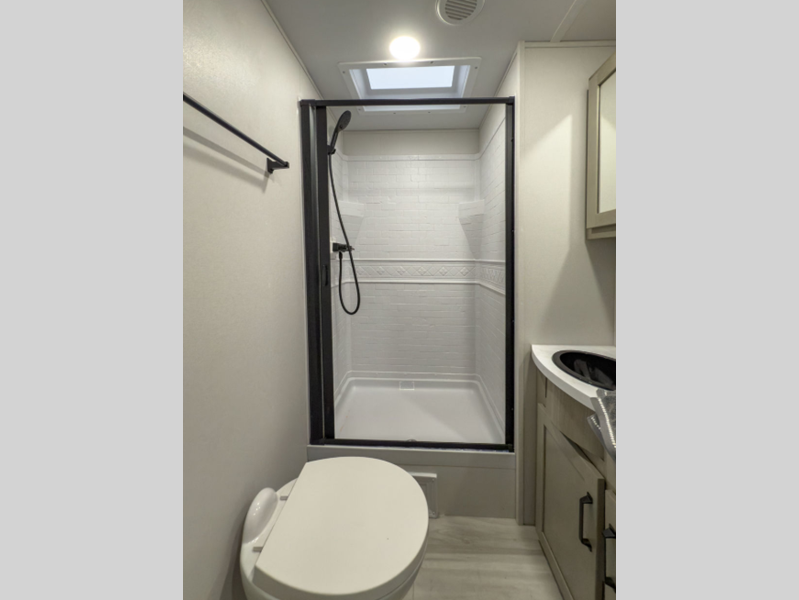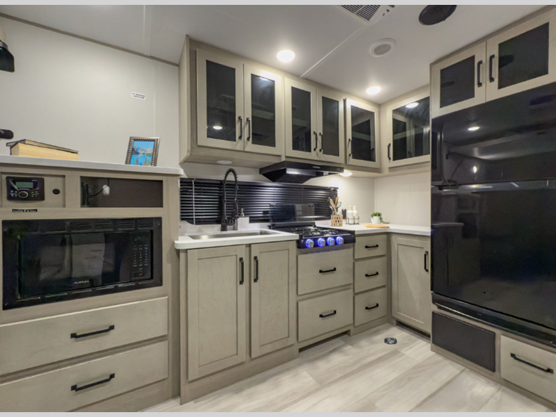 Sleeps 5 Length 26 ft 6 in Ext Width 8 ft 4 in Ext Height 12 ft 2 in Int Height 7 ft Hitch Weight 943 lbs GVWR 9950 lbs Dry Weight 5900 lbs Fresh Water Capacity 90 gals Grey Water Capacity 74 gals Black Water Capacity 37 gals Tire Size ST225/75R15LRE Furnace BTU 30000 btu Number Of Bunks 1 Available Beds Queen Murphy Refrigerator Type 12V Refrigerator Size 8 cu ft Cooktop Burners 3 Shower Size 24" x 32" Number of Awnings 1 Garage Size 13 ft 6 in LP Tank Capacity 20 lbs Water Heater Type Tankless AC BTU 15000 btu Awning Info 17' Power Axle Count 2 Number of LP Tanks 2 Shower Type Walk-In Shower Solar Wattage 180 watts Similar Floorplans