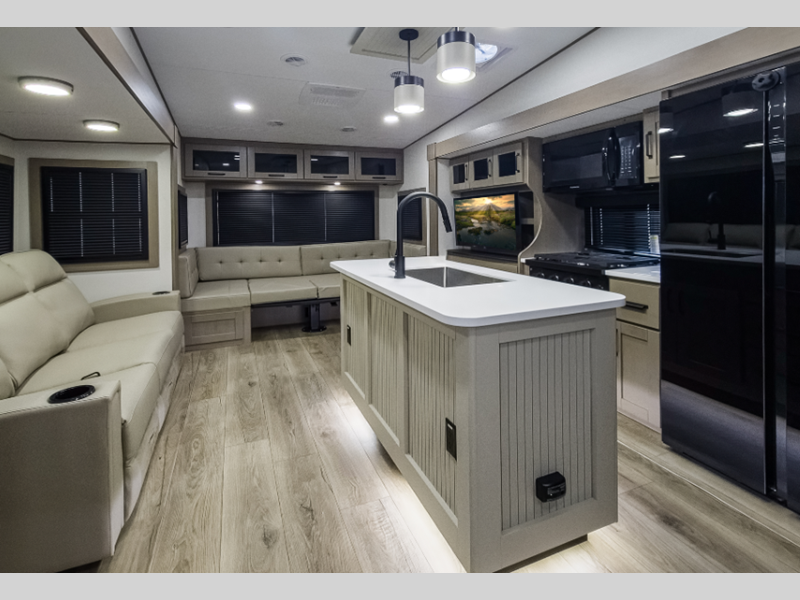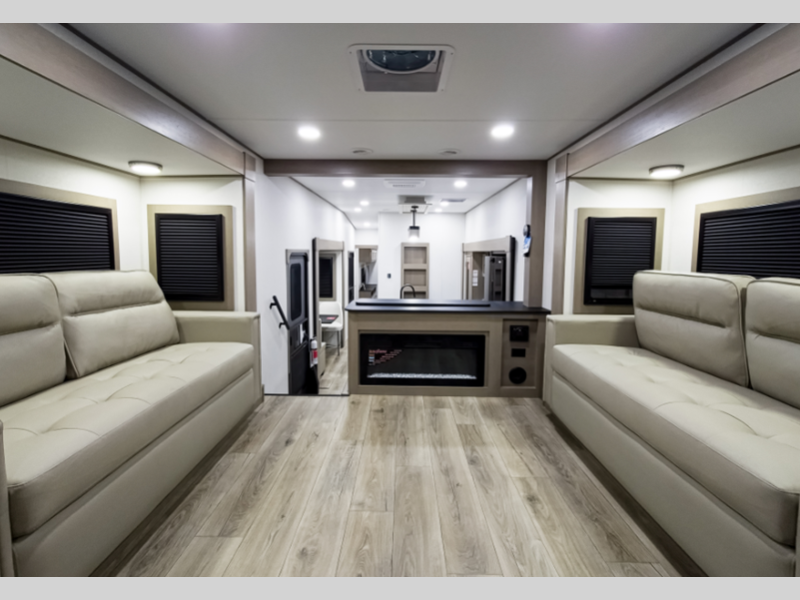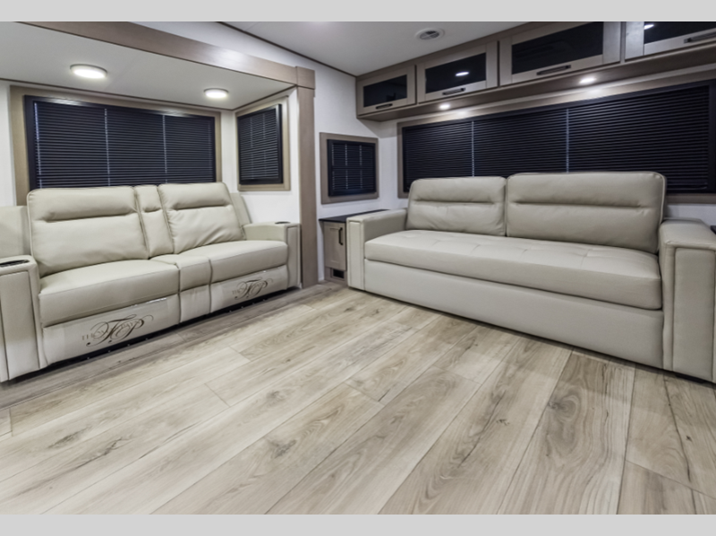 Sleeps 7 Slides 5 Length 39 ft 2 in Ext Width 8 ft Ext Height 12 ft 8 in Hitch Weight 2745 lbs GVWR 14995 lbs Dry Weight 12692 lbs Fresh Water Capacity 74 gals Grey Water Capacity 78 gals Black Water Capacity 39 gals Tire Size ST235/85R16LRE Furnace BTU 35000 btu Available Beds Queen Refrigerator Type 12V Refrigerator Size 16 cu ft Cooktop Burners 3 Shower Size 30" x 48" Number of Awnings 1 LP Tank Capacity 30 lbs Water Heater Type On Demand Tankless AC BTU 15000 btu TV Info LR 50" TV Lift Awning Info 19' One-Touch Electric LED Axle Count 2 Washer/Dryer Available Yes Number of LP Tanks 2 Shower Type Standard Electrical Service 50 amp Solar Wattage 370 watts Similar Floorplans