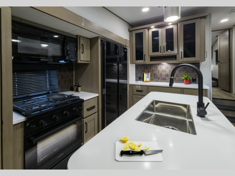 Sleeps 5 Slides 3 Length 34 ft 9 in Ext Width 8 ft Ext Height 12 ft 6 in Hitch Weight 2200 lbs GVWR 13995 lbs Dry Weight 11100 lbs Fresh Water Capacity 74 gals Grey Water Capacity 94 gals Black Water Capacity 47 gals Tire Size ST235/80R16RLE Furnace BTU 35000 btu Available Beds Queen Refrigerator Type 12V Refrigerator Size 16 cu ft Cooktop Burners 3 Shower Size 30" x 48" Number of Awnings 2 LP Tank Capacity 30 lbs Water Heater Type On Demand Tankless AC BTU 15000 btu TV Info LR 40" TV Awning Info 16' & 10'6" One-Touch Electric LED Axle Count 2 Washer/Dryer Available Yes Number of LP Tanks 2 Shower Type Standard Electrical Service 50 amp Solar Wattage 370 watts Similar Floorplans