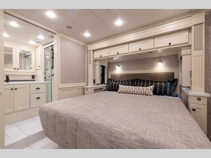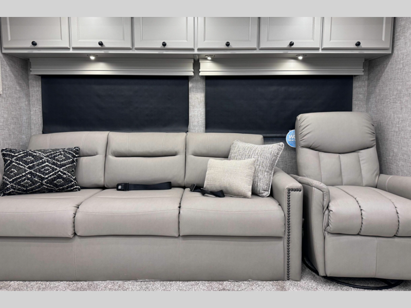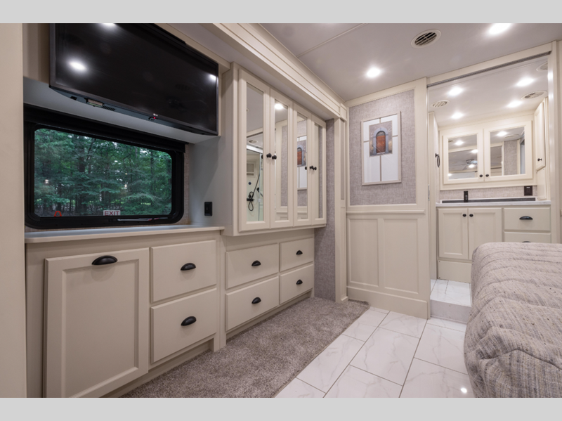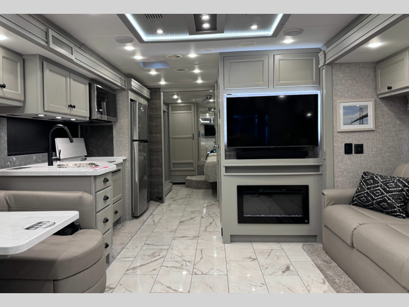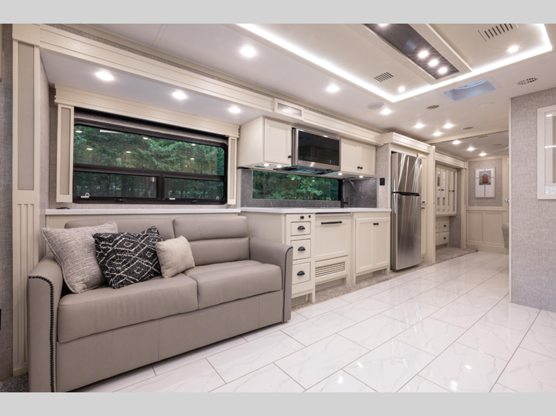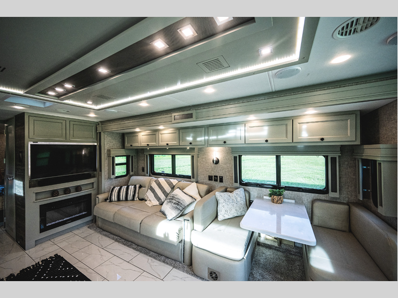 While you are inside, you will be surrounded by entertainment and comfort. The luxurious tile floor forms the base, and the handcrafted cabinetry comes in a few optional colors. The luxury continues on with the amazing kitchen, glamorous bedroom, and exceptional bathroom. All of the seating is both stylish and practical, and the centralized entertainment center with Blu-Ray player as well as the sound bar sound system with living area TV provide the modern entertainment you've come to expect.