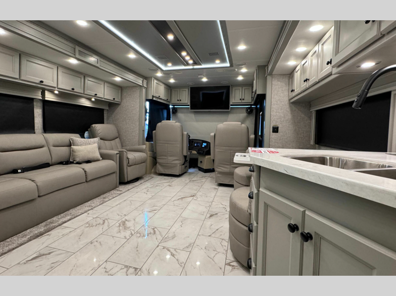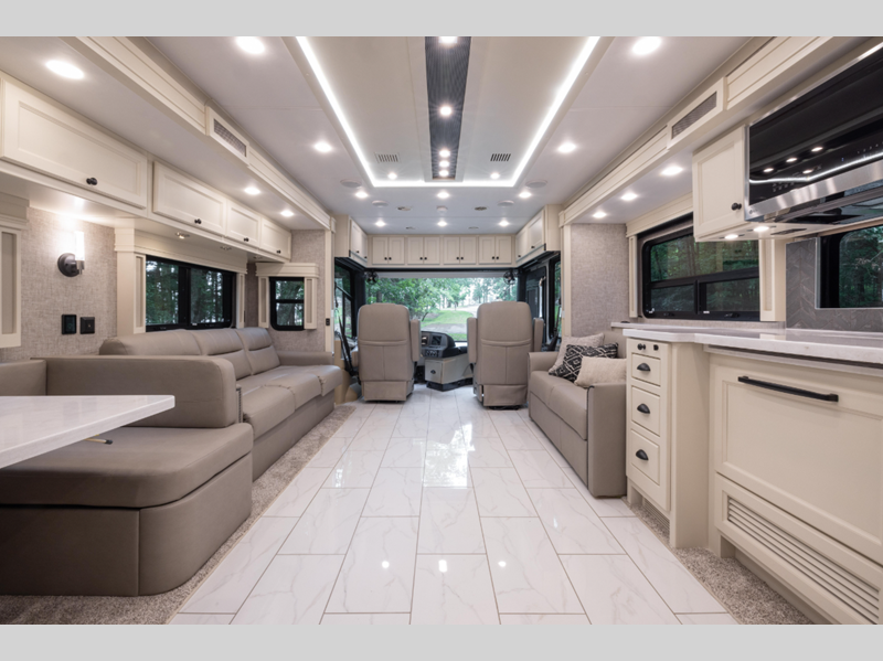 Sleeps 7 Slides 3 Length 38 ft 6 in Ext Width 8 ft 5 in Ext Height 12 ft 10 in Int Height 7 ft Interior Color Adobe Pendleton National Parks Collection, Morocco, Vapor Exterior Color Gen 5 and Gen 6 Paint Schemes; Nasa, Euro Blue, Bordeaux, Frosted Granite Hitch Weight 10000 lbs GVWR 38320 lbs Fresh Water Capacity 90 gals Grey Water Capacity 70 gals Black Water Capacity 50 gals Tire Size 295/80R 22.5 Furnace BTU 50000 btu Generator 8.0 kw Onan Quiet Diesel Fuel Type Diesel Engine Cummins L9 Chassis Freightliner XCM Modular Rail Rear Diesel Horsepower 380 hp Fuel Capacity 100 gals Wheelbase 234 in Available Beds King Torque 1150 ft-lb Refrigerator Type Stainless Steel Residential Refrigerator Size 20 cu ft Convection Cooking Yes Cooktop Burners 3 Shower Size 28.5" x 40.5" Number of Awnings 1 Axle Weight Front 14320 lbs Axle Weight Rear 24000 lbs LP Tank Capacity 36 gals Water Heater Type AquaHot Hydronic Heating System AC BTU 30000 btu Basement Storage 119 cu. ft. TV Info LR TV, BR TV, Ext. TV Awning Info Power w/LED Lighting Washer/Dryer Available Yes Gross Combined Weight 48320 lbs Shower Type Shower w/Seat Electrical Service 50 amp Similar Floorplans