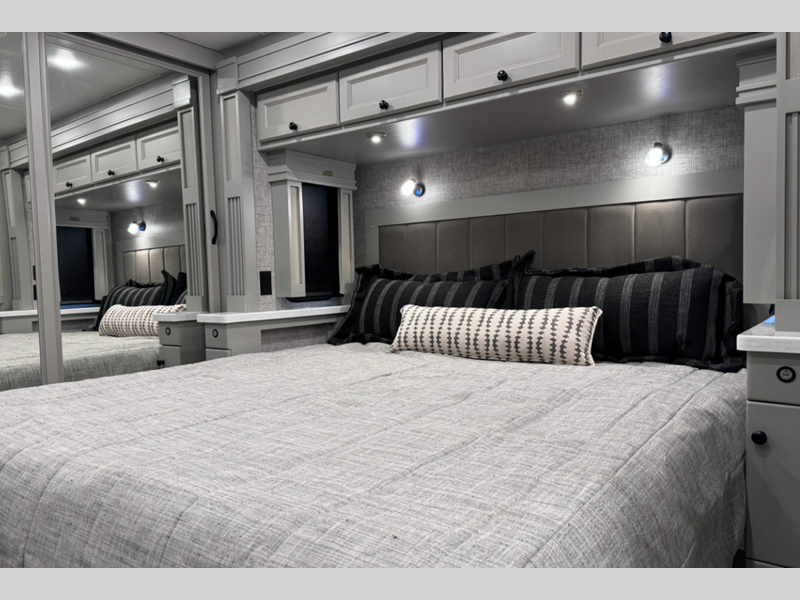 Sleeps 5 Slides 4 Length 35 ft 2 in Ext Width 8 ft 5 in Ext Height 12 ft 10 in Int Height 7 ft Interior Color Adobe Pendleton National Parks Collection, Morocco, Vapor Exterior Color Gen 5 and Gen 6 Paint Schemes; Nasa, Euro Blue, Bordeaux, Frosted Granite Hitch Weight 10000 lbs GVWR 38320 lbs Fresh Water Capacity 90 gals Grey Water Capacity 70 gals Black Water Capacity 50 gals Tire Size 295/80R 22.5 Furnace BTU 65000 btu Generator 8.0 kw Onan Quiet Diesel Fuel Type Diesel Engine Cummins L9 Chassis Freightliner XCM Modular Rail Rear Diesel Horsepower 380 hp Fuel Capacity 100 gals Wheelbase 198 in Available Beds King Torque 1150 ft-lb Refrigerator Type Stainless Steel Residential Refrigerator Size 20 cu ft Convection Cooking Yes Cooktop Burners 3 Shower Size 34.5" x 34.5" Number of Awnings 1 Axle Weight Front 14320 lbs Axle Weight Rear 24000 lbs LP Tank Capacity 36 gals Water Heater Type AquaHot Hydronic Heating System AC BTU 30000 btu Basement Storage 84 cu. ft. TV Info LR TV, BR TV, Ext. TV Awning Info Power w/LED Lighting Washer/Dryer Available Yes Gross Combined Weight 48320 lbs Shower Type Radius Electrical Service 50 amp Similar Floorplans