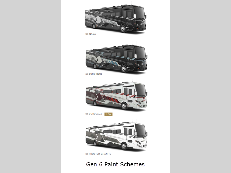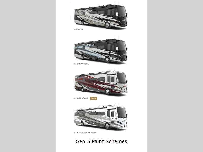 Sleeps 7 Slides 3 Length 39 ft 6 in Ext Width 8 ft 5 in Ext Height 12 ft 10 in Int Height 7 ft Interior Color Adobe Pendleton National Parks Collection, Morocco, Vapor Exterior Color Gen 5 and Gen 6 Paint Schemes; Nasa, Euro Blue, Bordeaux, Frosted Granite Hitch Weight 10000 lbs GVWR 38320 lbs Fresh Water Capacity 90 gals Grey Water Capacity 70 gals Black Water Capacity 50 gals Tire Size 295/80R 22.5 Furnace BTU 60000 btu Generator 8.0 kw Onan Quiet Diesel Fuel Type Diesel Engine Cummins L9 Chassis Freightliner XCM Modular Rail Rear Diesel Horsepower 380 hp Fuel Capacity 100 gals Wheelbase 252 in Number Of Bunks 2 Available Beds King Torque 1150 ft-lb Refrigerator Type Stainless Steel Residential Refrigerator Size 23 cu ft Convection Cooking Yes Cooktop Burners 3 Shower Size 28.5" x 40.5" Number of Awnings 1 Axle Weight Front 14320 lbs Axle Weight Rear 24000 lbs LP Tank Capacity 36 gals Water Heater Type AquaHot Hydronic Heating System AC BTU 30000 btu Basement Storage 119 cu. ft. TV Info LR TV, BR TV, Ext. TV Awning Info Power w/LED Lighting Washer/Dryer Available Yes Gross Combined Weight 48320 lbs Shower Type Shower w/Seat Electrical Service 50 amp Similar Floorplans