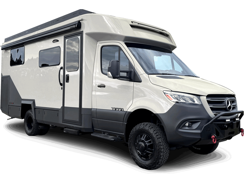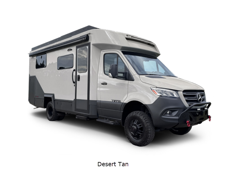 Sleeps 3 Length 25 ft 6 in Ext Width 7 ft Ext Height 11 ft 2 in Int Height 6 ft 8 in Interior Color Boho Chic Exterior Color Desert Tan, Cement Grey Full-Body Paint Choices Hitch Weight 5000 lbs GVWR 11030 lbs Fresh Water Capacity 40 gals Grey Water Capacity 48 gals Black Water Capacity 4.5 gals Tire Size 245/70R16 Generator Diesel Fuel Type Diesel Engine 2.0L I4 Turbo Diesel High Output Chassis Mercedes-Benz 3500XD AWD Dual Wheel Cutaway Horsepower 208 hp Fuel Capacity 24.5 gals Wheelbase 170.3 in Number Of Bunks 1 Available Beds Twin Torque 332 ft-lb Refrigerator Size 10.5 cu ft Convection Cooking Yes Cooktop Burners 1 Axle Weight Front 4410 lbs Axle Weight Rear 7720 lbs LP Tank Capacity 12 Gals. Water Heater Type Hydronic AC BTU 15000 btu Gross Combined Weight 15250 lbs Shower Type Wet/Bath Shower Electrical Service 30 amp