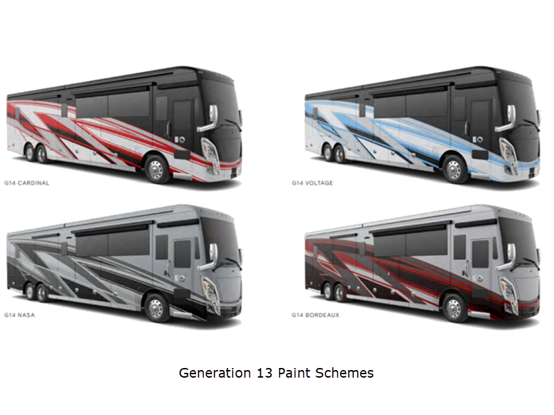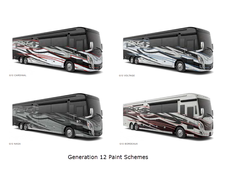 Sleeps 6 Slides 4 Length 45 ft Ext Width 8 ft 5 in Ext Height 13 ft 4 in Int Height 6 ft 11 in Interior Color Enchantment, Mystic Exterior Color Gen 12, Gen 13 Paint Schemes; Cardinal, Voltage, Nasa, Bordeaux Hitch Weight 20000 lbs GVWR 54000 lbs Fresh Water Capacity 100 gals Grey Water Capacity 100 gals Black Water Capacity 55 gals Generator 12.5 kW Onan Quiet Diesel Fuel Type Diesel Engine Cummins X15 Chassis PowerGlide Horsepower 605 hp Fuel Capacity 150 gals Wheelbase 316 in Available Beds King Torque 1950 ft-lb Refrigerator Type Stainless Steel Residential w/French Doors and Bottom Freezer Refrigerator Size 22 cu ft Convection Cooking Yes Shower Size 32" x 48" Number of Awnings 2 Axle Weight Front 20000 lbs Axle Weight Rear 20000 lbs Axle Weight Tag 14000 lbs AC BTU 45000 btu Basement Storage 237 cu. ft. TV Info LR TV, BR TV, Ext. TV Awning Info Girard Power with Integrated LED Lighting Gross Combined Weight 74000 lbs Shower Type Shower w/Seat Electrical Service 50 amp Similar Floorplans
