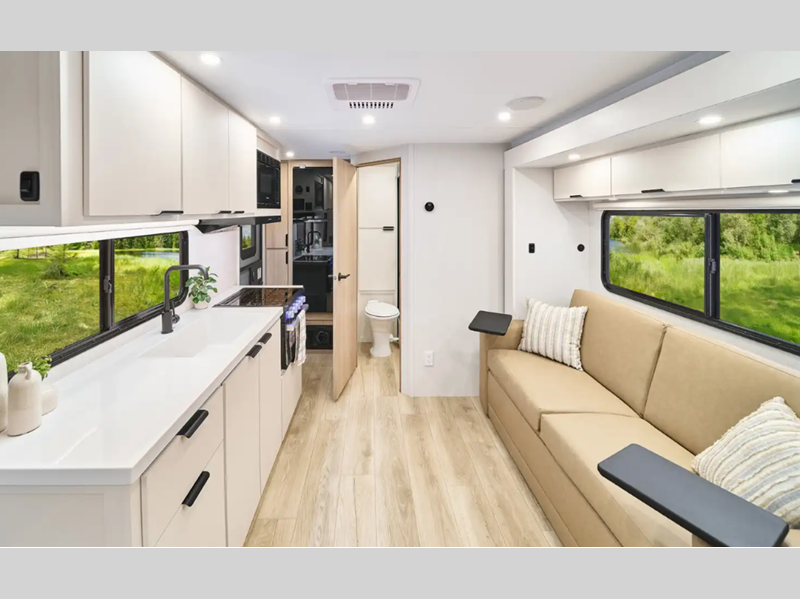 Sleeps 3 Slides 2 Length 30 ft 11 in Ext Width 8 ft 1 in Ext Height 11 ft 2 in Int Height 6 ft 8 in Interior Color Modern Luxe Hitch Weight 950 lbs GVWR 8800 lbs Dry Weight 7470 lbs Fresh Water Capacity 60 gals Grey Water Capacity 98 gals Black Water Capacity 49 gals Tire Size 225/75R15E Furnace BTU 30000 btu Available Beds Olympic Queen Refrigerator Type 12V Refrigerator Size 10.6 cu ft Cooktop Burners 3 Shower Size 30" x 36" Number of Awnings 1 Axle Weight 4400 lbs LP Tank Capacity 40 lbs. Water Heater Type Tankless AC BTU 15000 btu TV Info Smart TV Awning Info 16' Powered patio awning w/LED lighting Axle Count 2 Number of LP Tanks 1 Shower Type Radius Electrical Service 30 amp Solar Wattage 200 watts Similar Floorplans
