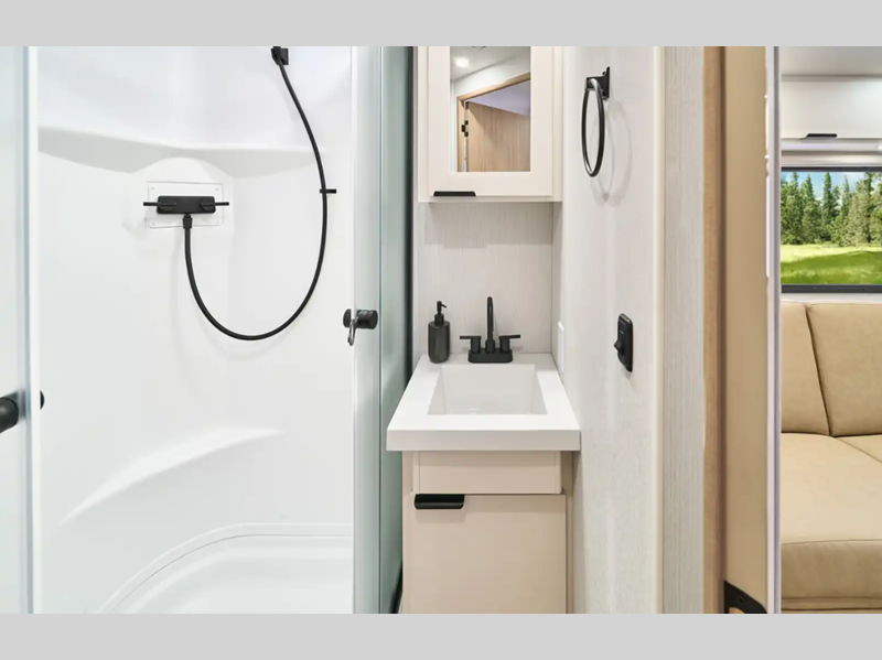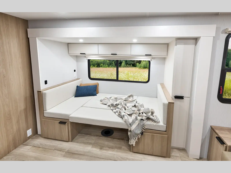 Each Thrive is built with an NXG engineered frame, fiberglass sidewalls with Azdel and a one-piece TPO roof membrane for added durability. There is a power tongue jack and power stabilizer jacks outside for hassle-free set up, and the 200-watt solar panel will provide some off-grid capabilities. Inside, there are many comforts of home including roller shades, residential recessed ceiling lights, versatile sleeping arrangements and more!