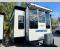 Enter the sliding patio doors and see a spacious kitchen area straight ahead. There is a counter peninsula with overhead storage, and a double kitchen sink close to the end of the peninsula. There is a slide out three burner range with overhead microwave oven, and a residential refrigerator for your perishables. The interior wall of the kitchen features floor to ceiling pantry storage, plus a appliance center with overhead storage.