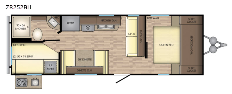 A rear bunk house, two kitchens (one inside and one outside), plus plenty of space to entertain a few friends can be found throughout this Zinger ZR252BH CrossRoads RV travel trailer. When you choose to camp with this travel trailer you can even bring along a few friends since there are (2) 50" x 74" bunks in the rear. In the combined kitchen and living area you will find a 64" jack-knife sofa plus the kitchen is fully equipped so you can create the meals that you enjoy most. After a fun day of playing outside then you can come get a good night's rest at the queen bed in the private front bedroom. The outside kitchen allows you to spend more time outdoors with your family while fixing a snack or dinner!