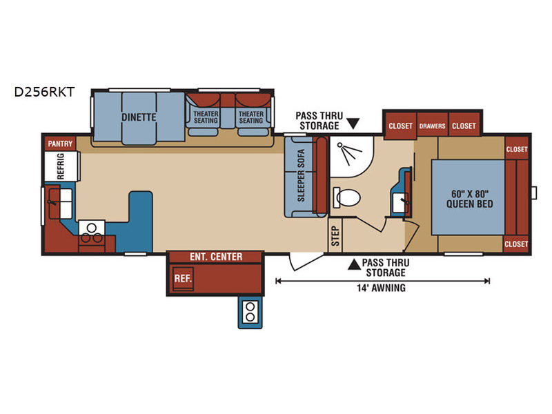 This KZ Durango 1500 Sport D256RKT fifth wheel has all you need plus more! It features not only theater seating, but also a sleeper sofa which can be converted into an extra sleeping space. You can easily meal prep in the kitchen or change things up and cook at the outdoor kitchen. There is a front private bedroom with a queen bed, closet, drawers, and you even have access to the dual entry bath. Don't leave anything behind because you can easily store and access your camping gear inside the pass-through storage!
