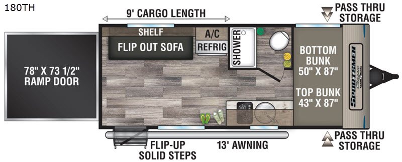 The adventure has just begun once you load up your motorcycles using the 78" x 73 1/2" ramp door into the 9' cargo area in this Sportsmen Classic toy hauler. Once at your destination, you can quickly unload and set up the main living area by placing the flip-out sofa into place, storing your keys and such on the shelf above, grabbing a snack from the 4 cu. ft. refrigerator, or making a meal on the two-burner range. After hitting the trails, you can relax under the 13' power awning, store some outdoor gear in the pass-through storage compartment, then head inside to take a shower in the private bathroom. You can then find your sleeping space on the bunk beds and sofa and then do it all over again the next day.