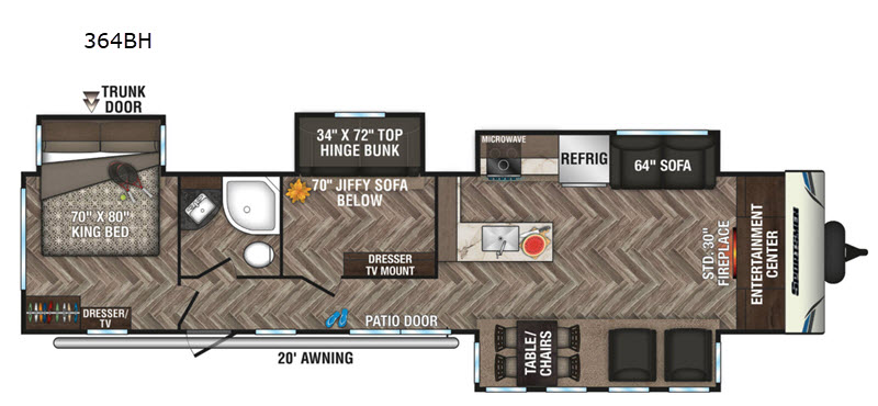 The kids will love this travel trailer with its private bunkhouse that includes a jiffy sofa with a hinged bunk above. Mom and dad will appreciate their own private bedroom with king bed slide out and closet space for their clothes. Head to the main living area where you'll find dual opposing slides for maximum space, an LED TV, plus a 30" fireplace. Your crew will have plenty of seating space between the 64" sofa and dual recliners, and the free-standing table with chairs will be the perfect place to dine together. This model features a counter peninsula for extra prepping space and the three burner cooktop along with the stainless steel microwave will allow you to whip up any meal you have planned.